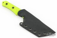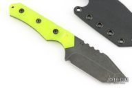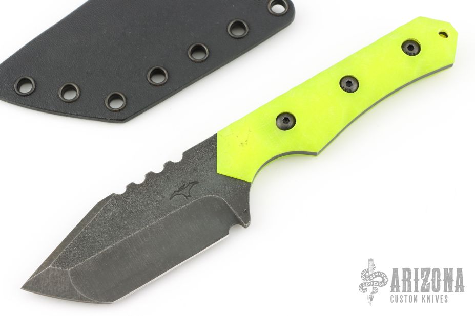 This Full-size Tanto by Tactical Pterodactyl features a dark stonewashed tanto blade with a notched thumbrest, .144" blade stock and 1.493" blade depth, full tang construction. The handle has dayglow yellow G-10 scales. Comes with a kydex sheath and COA. Excellent condition.