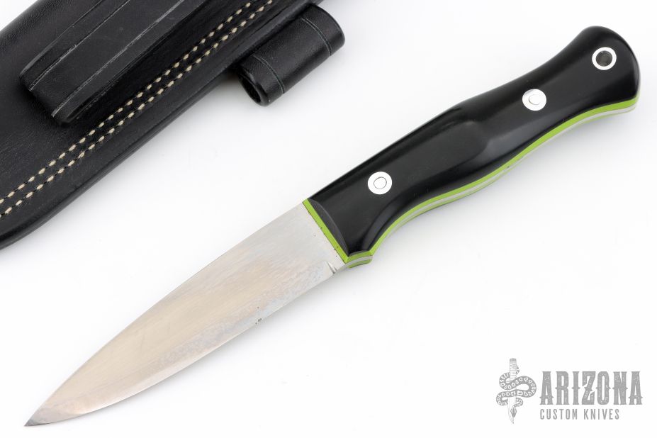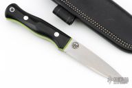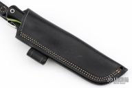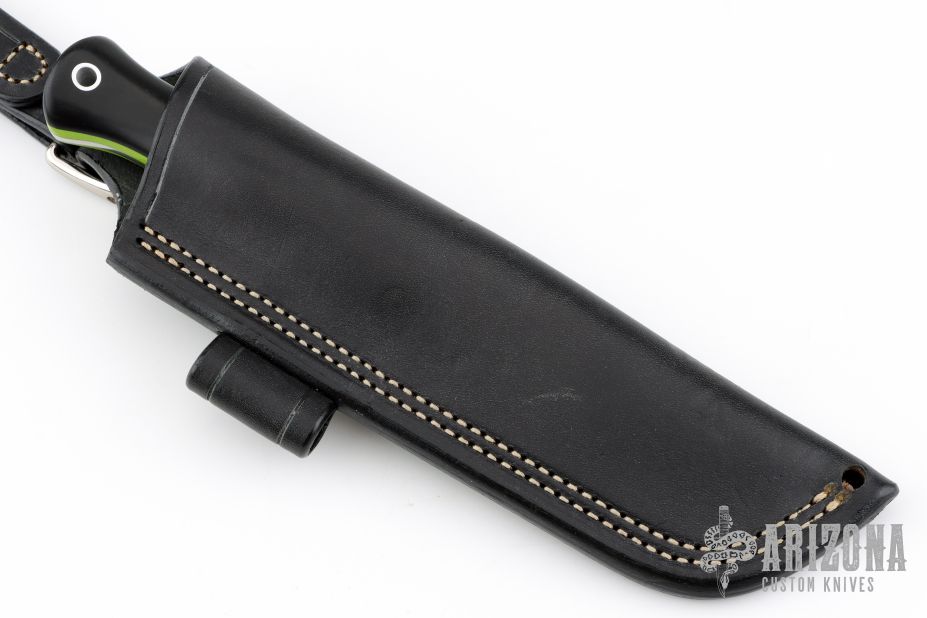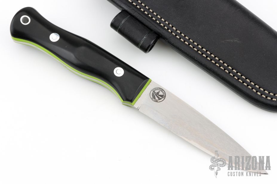 This Mountaineer from Adventure Sworn features a hand rub satin finished scandi ground blade with .121” blade stock and 1.062” blade depth, full tang construction. The handle has black paper micarta covers, with green G-10 liners and stainless steel bolts. Comes with a brown leather sheath. Has a few light scratches, otherwise excellent condition.