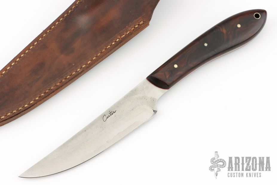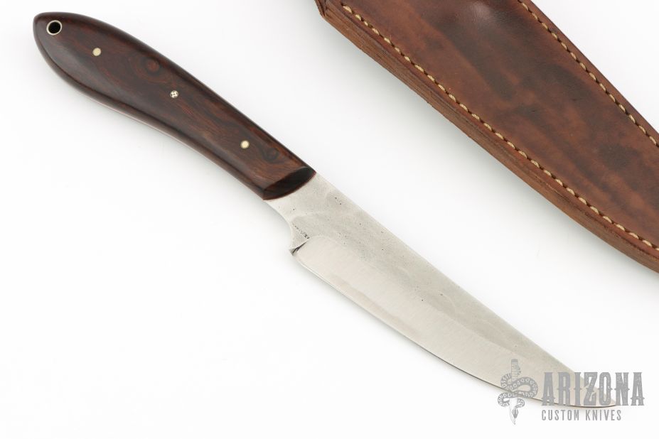 The White Crane by Murray Carter features a Stainless Clad San Mai steel blade with lightly hammer marked flats, .153" blade thickness and 1.191" blade depth, full tang construction. The handle has ironwood scales with nickel silver and mosaic pins. Comes with a brown leather sheath. Has a few very light scratches, otherwise excellent condition.