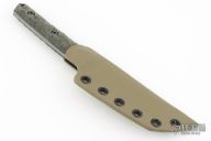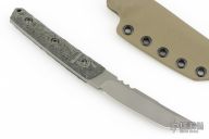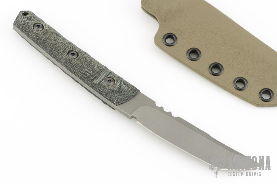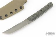 This American Samurai V1 by Tactical Pterodactyl features an upswept tanto blade with a stonewash finish, notched thumbrest, .157" blade stock and .809" blade depth, full tang construction. The handle has sculpted black canvas micarta scales. Comes with a kydex sheath, original box and invoice. Excellent condition.
