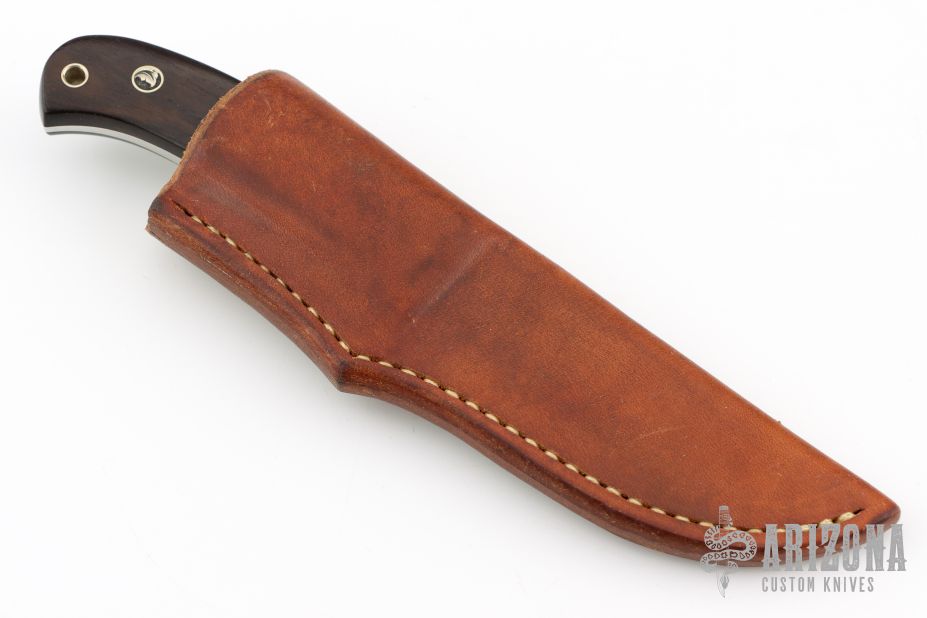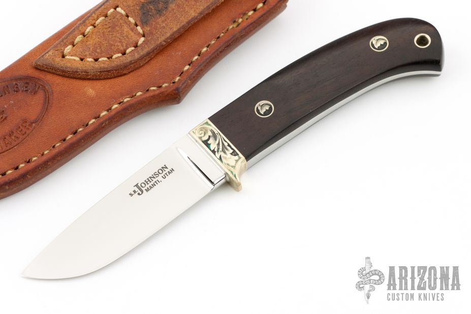 This Drop Point Hunter by Steve Johnson features a mirror polished blade, .204" blade thickness and .827" blade depth, full tapered tang construction. The handle has an engraved nickel silver guard and ebony scales with engraved nickel silver pins. Comes with a brown leather sheath. Excellent condition. Engraved by "Steve Lindsay"