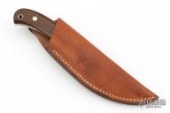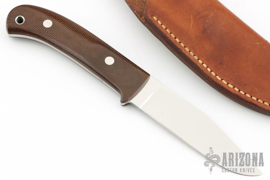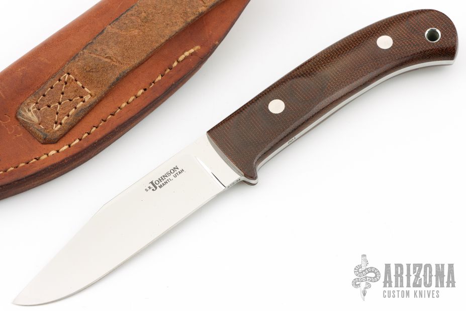 This Clip Point Hunter by Steve Johnson features a mirror polished blade, .114" blade thickness and .940" blade depth, full tang construction. The handle has brown canvas micarta scales with stainless steel pins and lanyard hole. Comes with a brown leather sheath. Excellent condition.