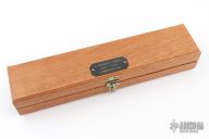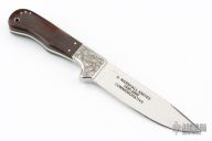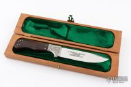 This knife by Glenn Marshall is part of a limited run of 70 knives made to mark 70 years as a knife maker, it has a mirror polished blade with fileworked spine, .188" blade stock and 1.234" blade depth, full tapered tang construction. The handle has engraved and dovetailed stainless steel bolsters, wood scales, lanyard hole at the butt, fileworked tang. Comes with a wooden display box. Has some light scratches, otherwise excellent condition. Glenn was the first inductee into the Texas Knifemakers Hall of Fame.