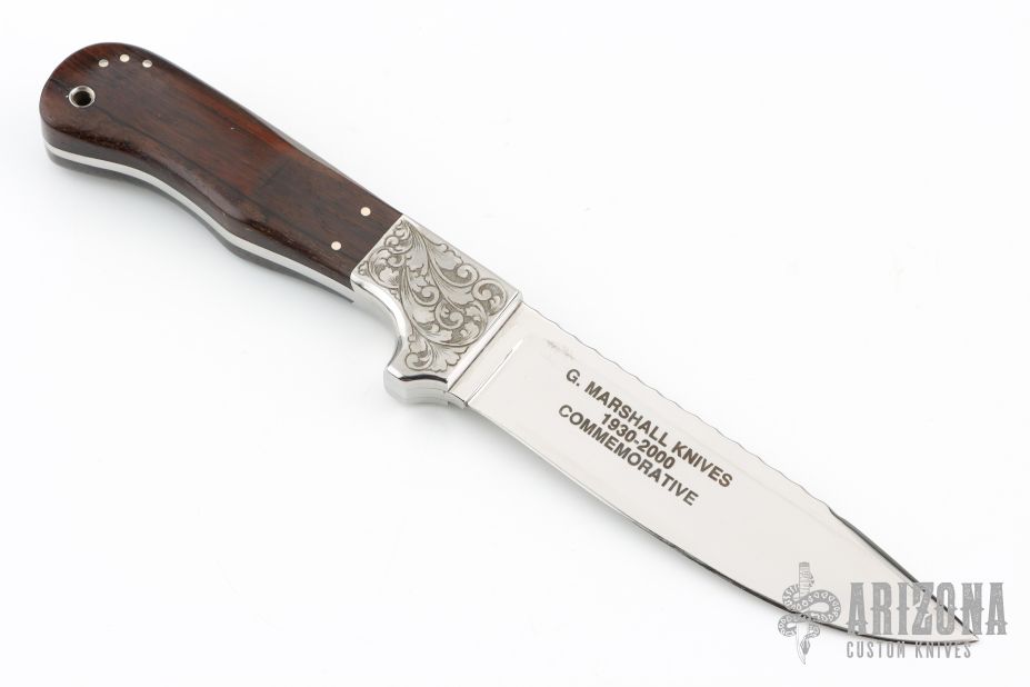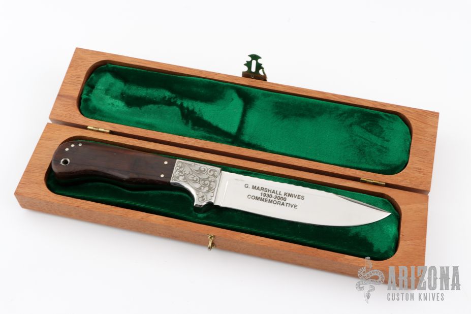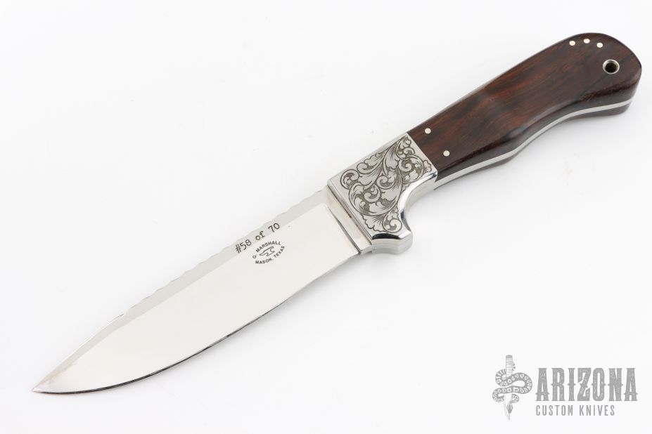 This knife by Glenn Marshall is part of a limited run of 70 knives made to mark 70 years as a knife maker, it has a mirror polished blade with fileworked spine, .188" blade stock and 1.234" blade depth, full tapered tang construction. The handle has engraved and dovetailed stainless steel bolsters, wood scales, lanyard hole at the butt, fileworked tang. Comes with a wooden display box. Has some light scratches, otherwise excellent condition. Glenn was the first inductee into the Texas Knifemakers Hall of Fame.