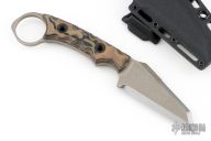 The blade is a T.Kell twist on the Wharncliffe blade with some Reverse Tanto and pikal thrown in. The Wharncliffe is often thought of as a go-to CQB blade with the Reverse Tanto being a close second. So why not make the ultimate CQB blade by combining the two and putting them on our famed Night series handle platform! The Nightguard has a dead flat typical edge, We added reverse tanto style reverse edges and this thing turned out to be nothing but nasty. Keeping with the CQB blade theme it has a very steep 30 degree grind allowing it to make deep and wide cuts while maintaining a blade thickness to withstand it all. Made from 80CRV2 high carbon steel heat treated to 59 HRC using our detailed heat treatment process.