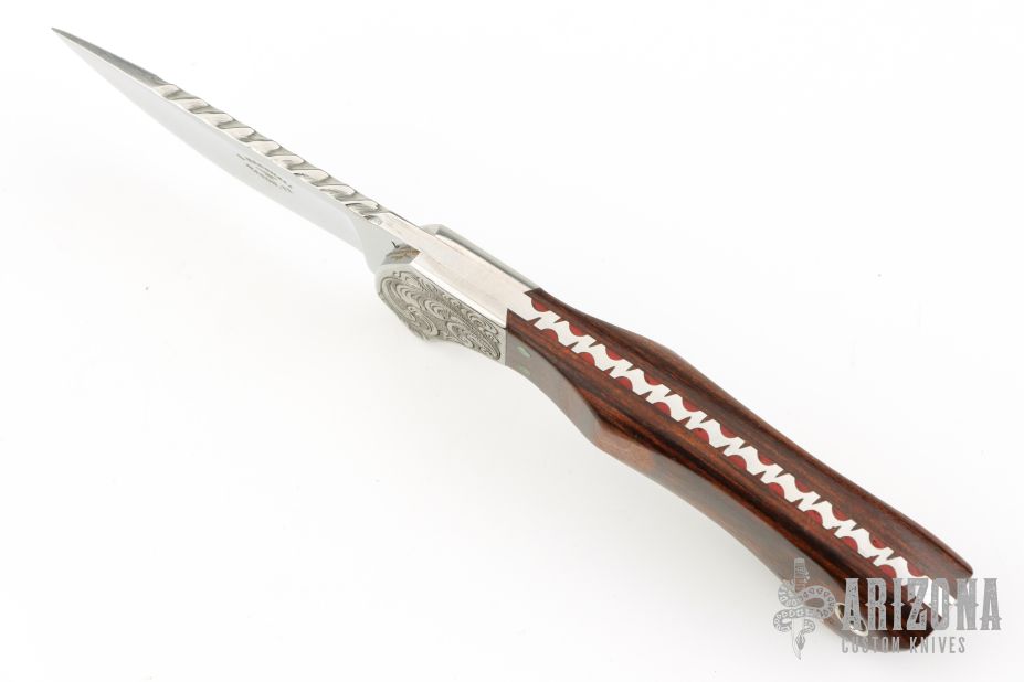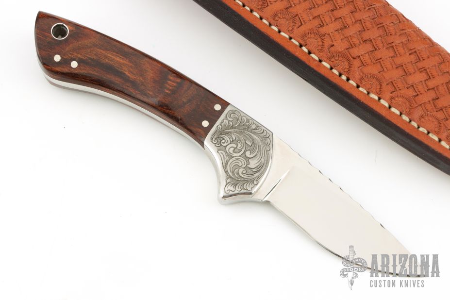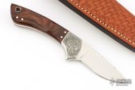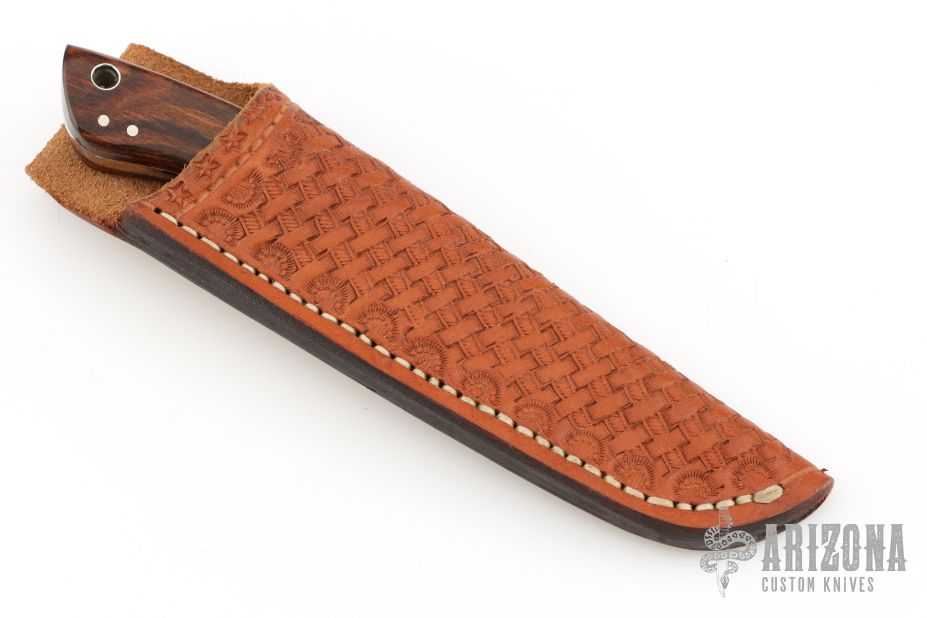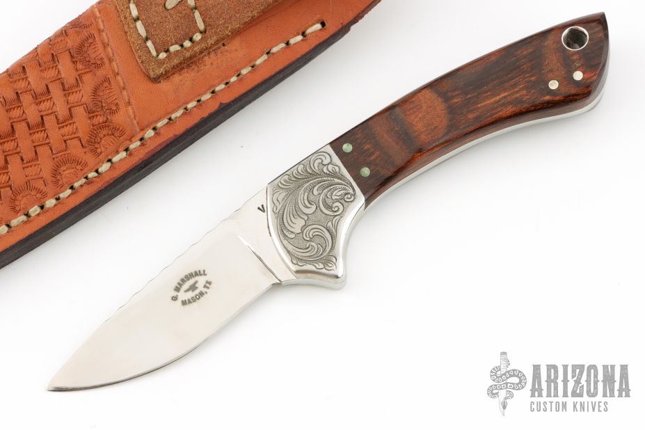 This knife by Glenn Marshall has a mirror finished blade with fileworked spine and tang, .124" blade stock and .831" blade depth, full tapered tang construction. The handle has engraved and dovetailed stainless steel bolsters, dymondwood scales, nickel silver pins. Has some light scratches, otherwise excellent condition. Comes with a hand tooled brown leather sheath. Glenn was the first inductee into the Texas Knifemakers Hall of Fame.