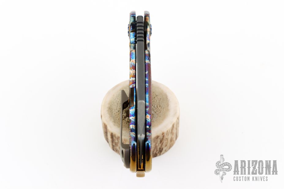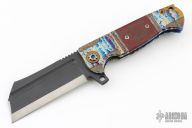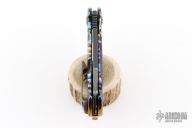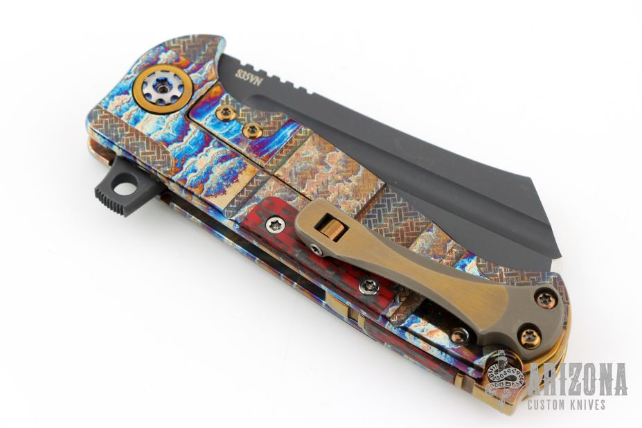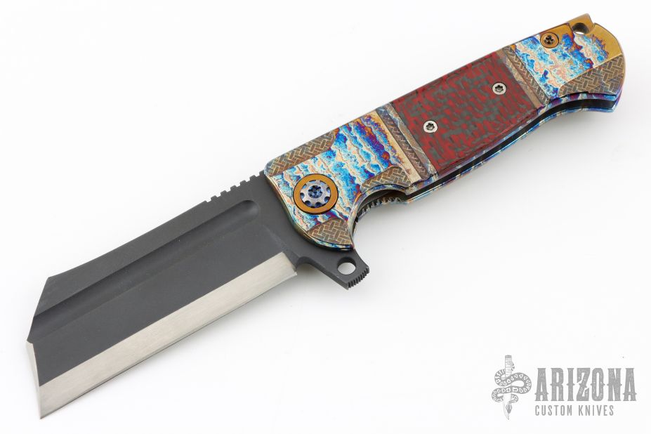 This ADV Mini War-Hulk framelock flipper has black coated blade with notched flipper and thumbrest. Handle has a laser engraved and anodized titanium frame with red carbon fiber inlays, two-tone tip up clip with roller. Has stainless steel lockbar insert and lockbar stabilizer. Nice smooth action, detent, lockup and blade seating. Comes with a plastic case. Excellent condition.