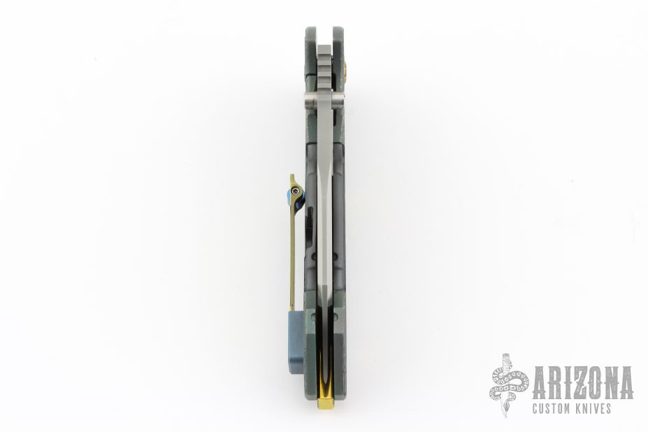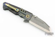 This Butcher by Andre De Villiers features a two tone, compound ground wharncliffe style blade swedge, fullers notched thumb rest, dual thumb studs and flipper. The handle is comprised of two tone machined and anodized titanium with matching tip up clip over an anodized titanium backspacer. Lanyard hole in pommel. Great blade seating, detent and lock up.  Includes a padded zippered case.  Excellent Condition.