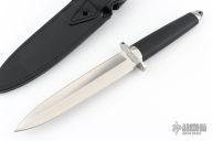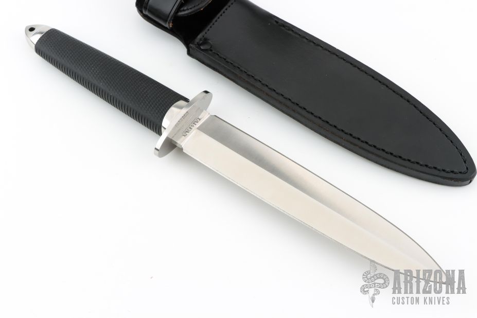 This Tai Pan from Cold Steel features a satin finished double-edged blade, .190" blade stock and 1.340" blade depth, hidden tang construction. The handle has a stainless steel guard and pommel, and rubber grip. Comes with original black leather sheath and original box. Excellent condition. Made in Japan