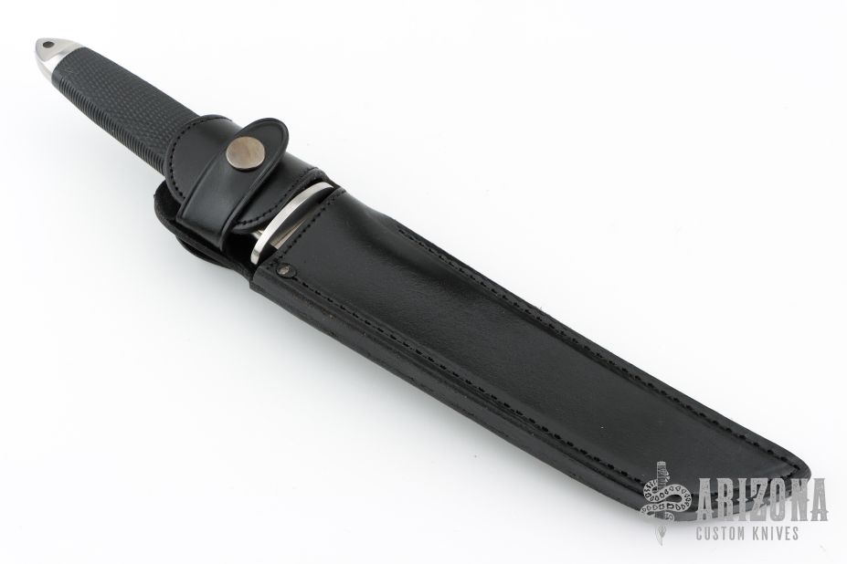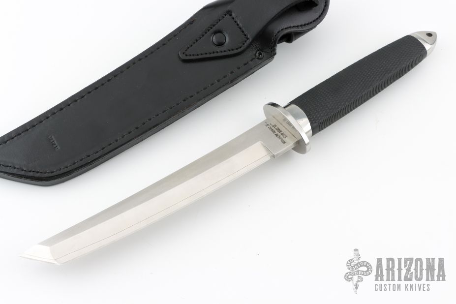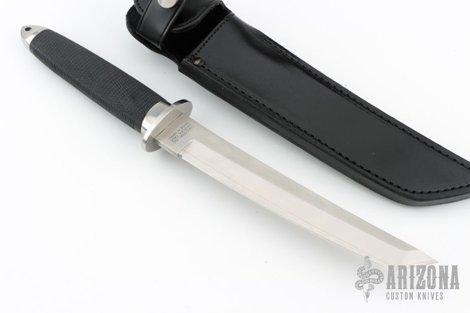This Magnum Tanto by Cold Steel features a trailing point tanto style San Mai blade with .187" blade stock and 1.110" blade depth. The handle is comprised of a steel guard and pommel with a textured rubber grip over hidden tang construction. Includes original black leather sheath with belt loop, original box and papers. Excellent condition.