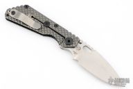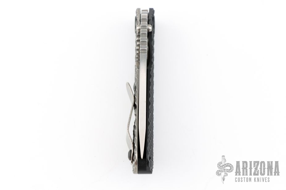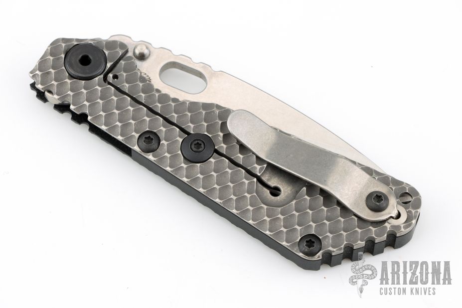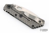 This SNG DGG by M Strider has a stonewashed blade with dual thumb studs, thumbhole, and notched thumbrest. Handle is black G-10 and bead blasted titanium "Gunner Grip", lockbar stabilizer, and titanium tip up clip. Nice detent, lockup and blade seating. Excellent condition.