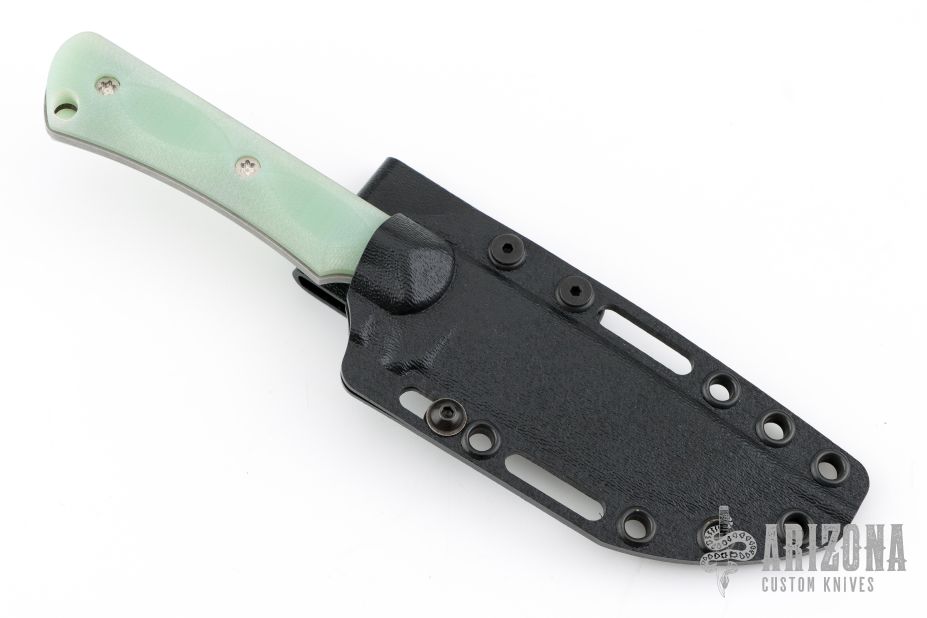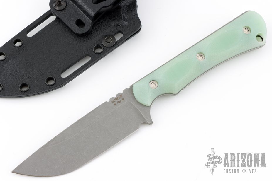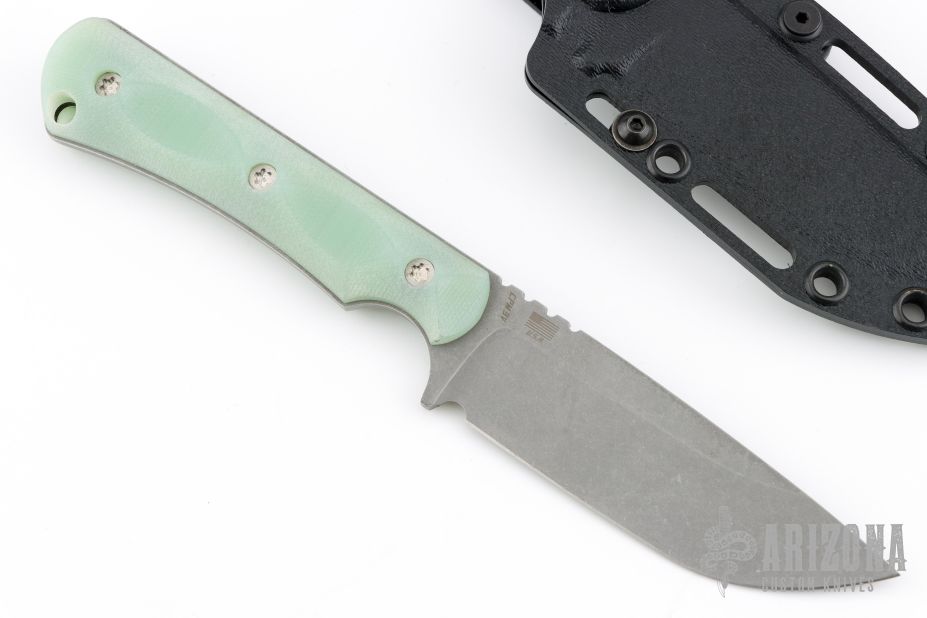 This fixed blade, by Johnathan Mcnees, features an acid/tumble finish drop point style blade with full tang construction. .135" Blade Stock 1.15" Blade Depth. The handle is composed of contoured green G10 scales. The pommel features a lanyard hole. Includes original box, kydex sheath, and COA. Excellent condition.