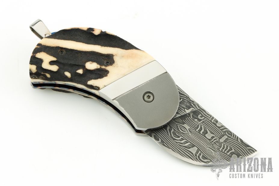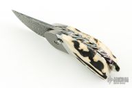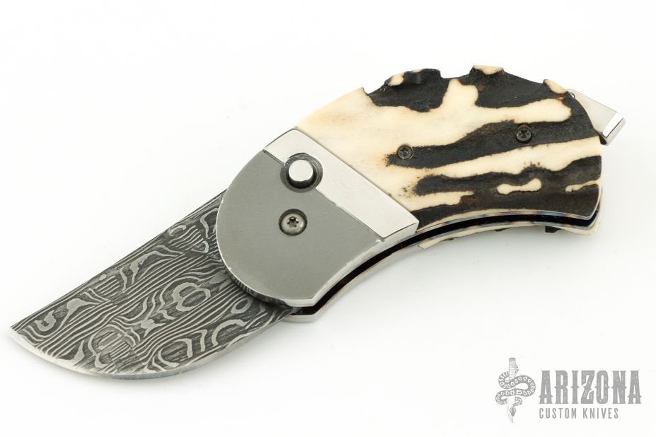 This Minnow Auto by Philip Booth features a Damascus blade with nail nick. The handle has two-tone dovetailed stainless steel bolsters stag scales, flamed stainless steel liners, fileworked stainless steel backspacer. Comes with a zippered case. Has a couple very light scratches, otherwise excellent condition.