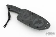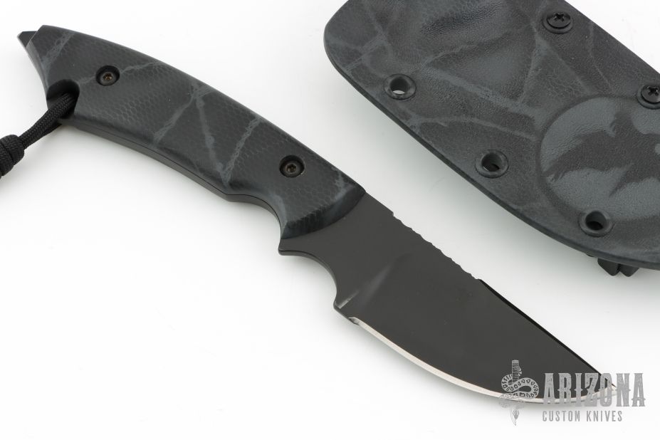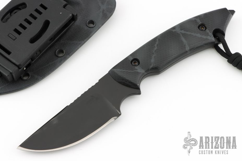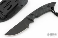 This hunter by Keith Murr features a black blade with notched thumbrest and black G-10 scales with chainlink coating, .144" blade stock and 1.368" blade depth, full tang construction. Comes with a kydex sheath, with a belt clip. Has some scuffs from the sheath, otherwise excellent condition.