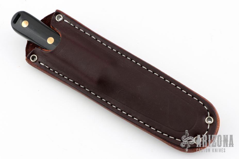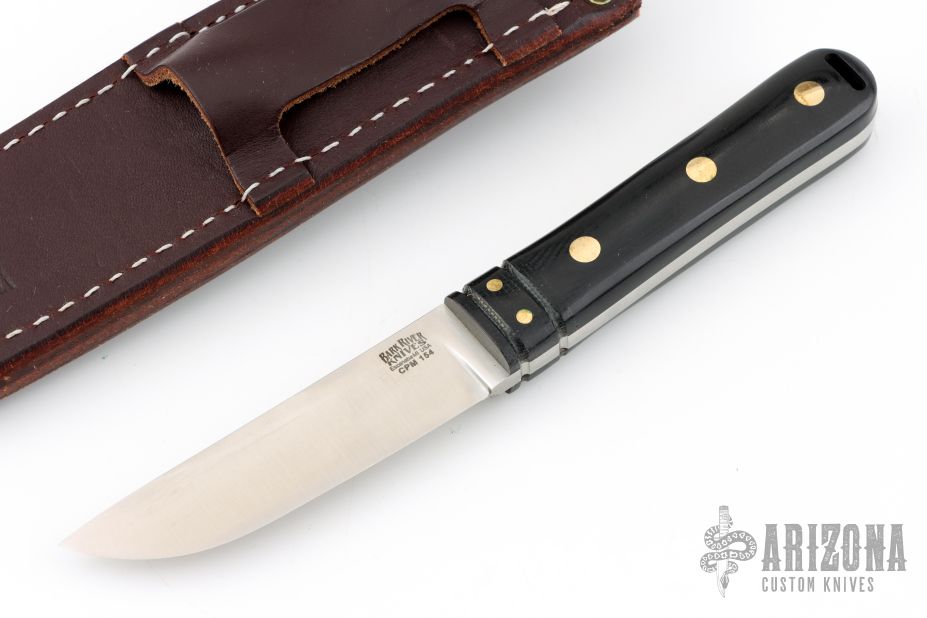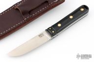 This Kitsune Tanto by Bark River Knives features a satin finished blade with .190" blade stock and .878" blade depth, full tang construction. The handle has black G-10 scales with brass pins and a lanyard hole. Comes with brown leather sheath and original box. Excellent condition.