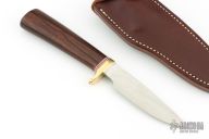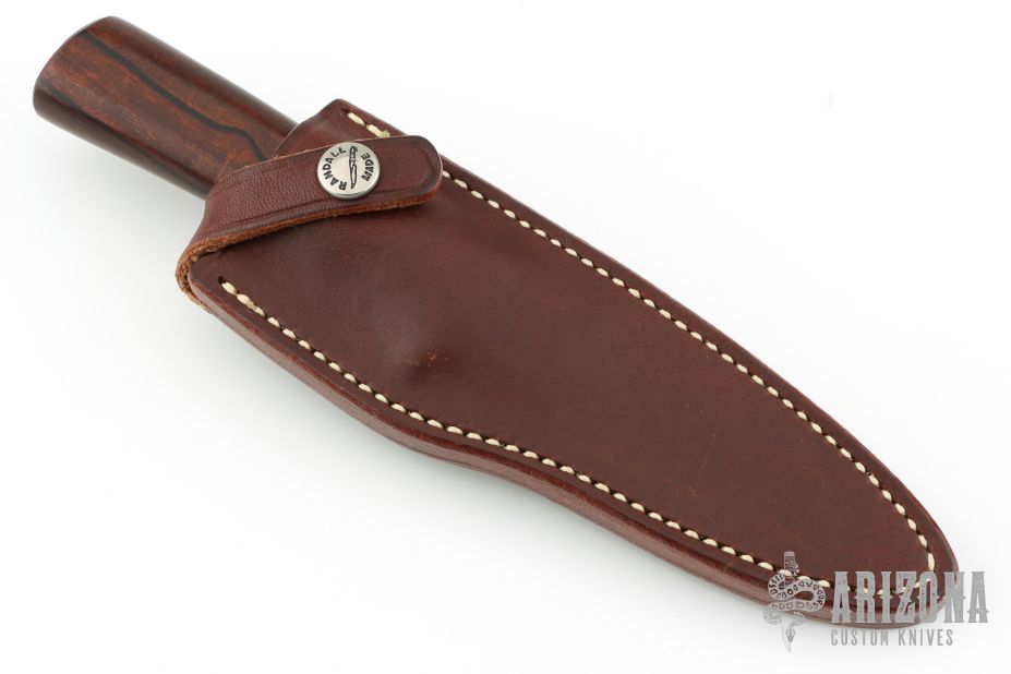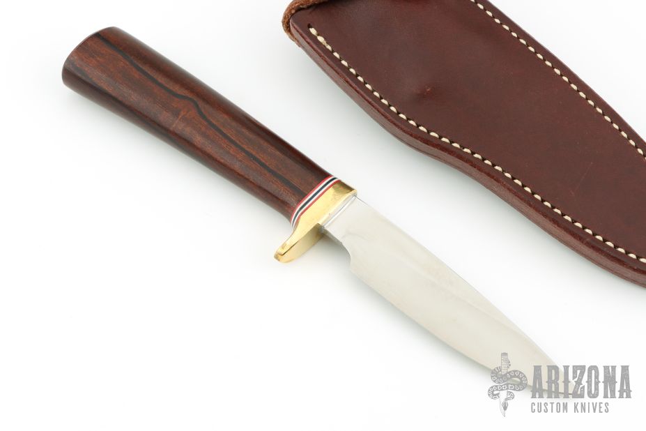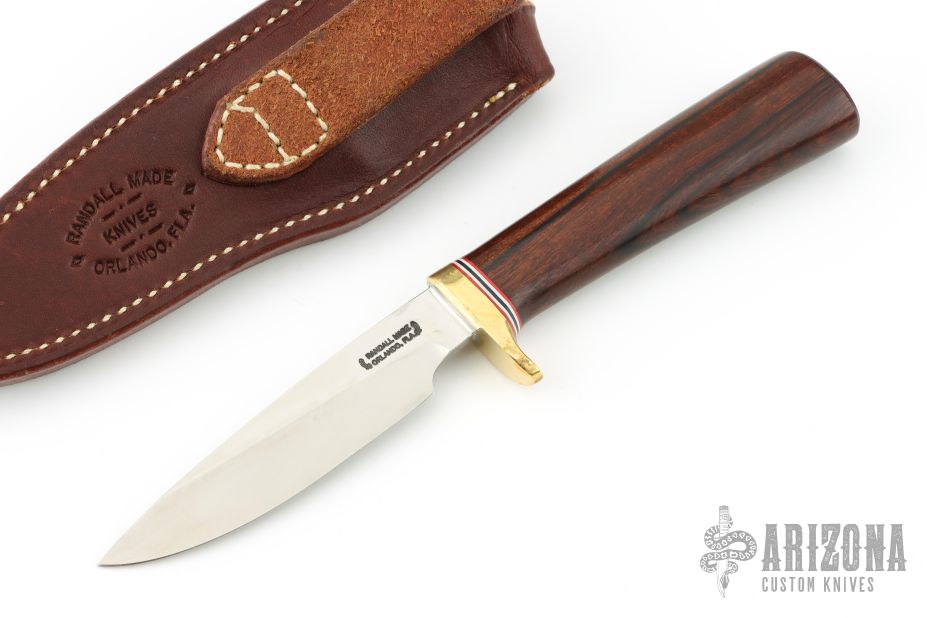 This Model 26 Pathfinder by Randall Made Knives is one of Randall's best selling models. It features a drop point satin finished blade with .144" blade stock and .912" blade depth, hidden tang construction. The handle has a brass guard, desert ironwood grip and red/white/blue spacers. Comes with a brown leather sheath. Excellent condition.