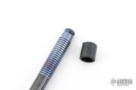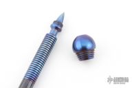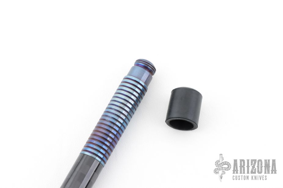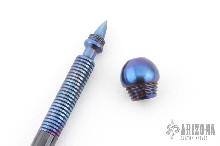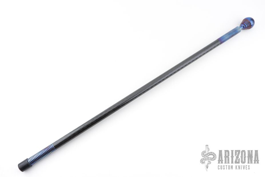 This handcrafted Titanium and Carbon Fiber cane by Pavlin Shahanov features a flame anodized spike and cap, paired with a carbon fiber shaft. One end has a rubber cap covering threads, if you remove the ball on the top end it reveals the spike, and it can be put on the other end. New from maker!