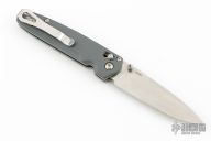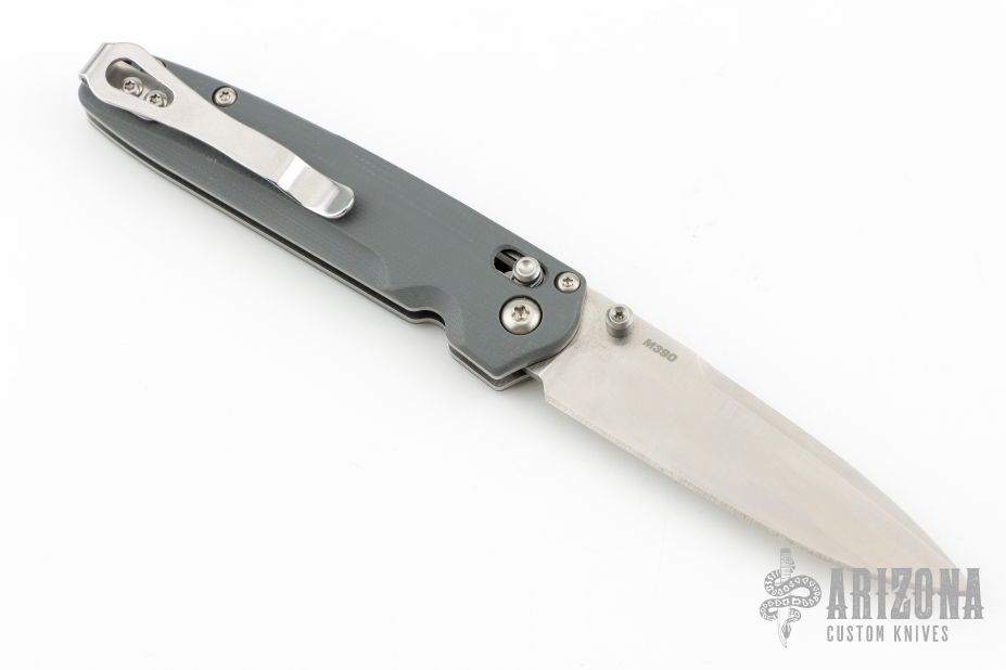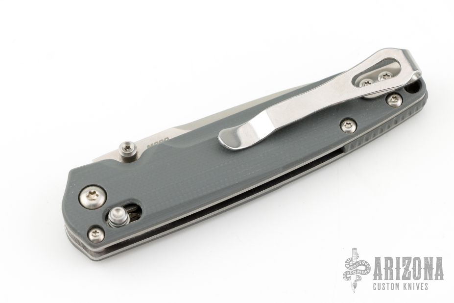 This 485 Valet by Benchmade features a tumble finished drop point blade with swedge and dual thumb studs. The handle is comprised of gray G10 over steel liners. Lanyard hole in pommel and the deep carry clip is reversible for left or right hand tip up carry. Has a couple light scuffs and scratches, great condition otherwise.