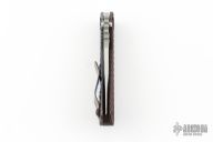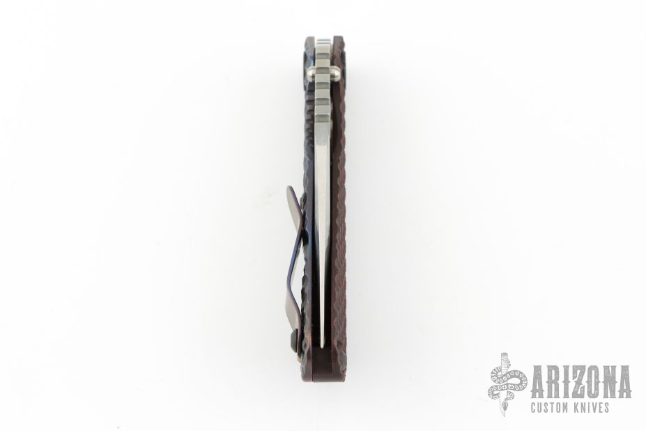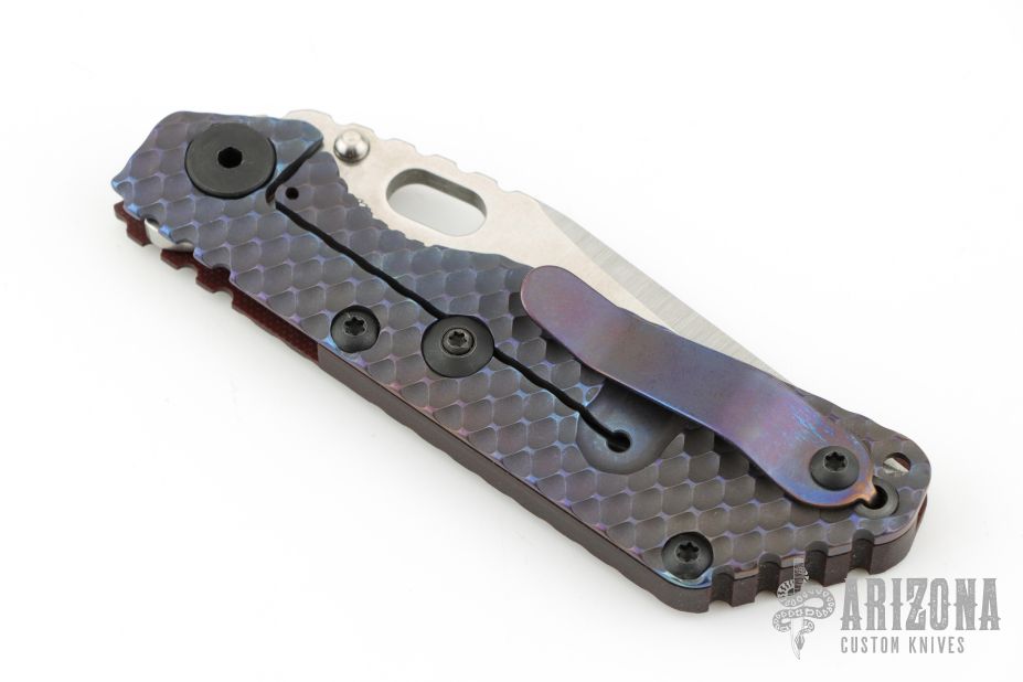This SNG DGG by Strider has a satin/stonewash finished Bowie blade with dual thumb studs, thumb hole, and notched thumb rest. Handle has a black/red G-10 and anodized titanium "Gunner Grip", lockbar stabilizer, and titanium tip up clip. Nice detent, lockup and blade seating. Excellent condition.