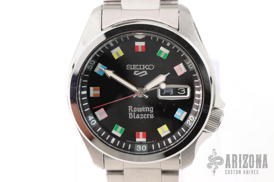 Limited-edition Rowing Blazers x Seiko 5 Sports watch featuring a colorful, vintage-inspired dial; steel bracelet; monogrammed crown; “candy cane” second hand; and case back adorned with our Derry Bones “Tempus Fugit” motif. Designed by Rowing Blazers Creative Director Jack Carlson and vintage watch expert Eric Wind of Wind Vintage in partnership with Seiko.
