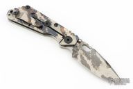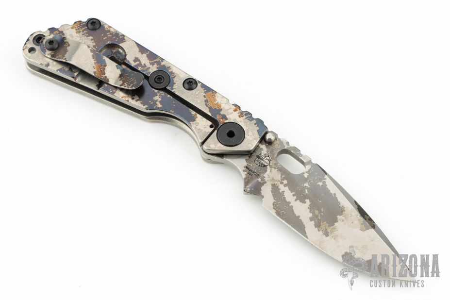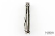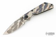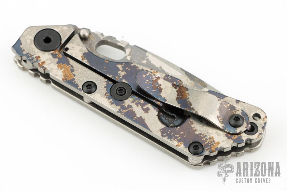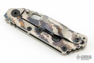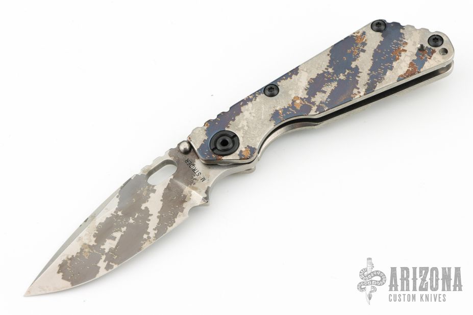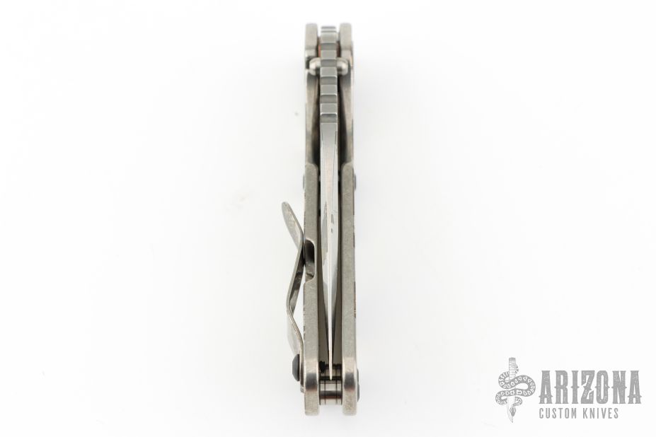 This Mick Strider Performance series SNG framelock folder features a drop point blade with thumbhole and notched thumbrest. The handle has a titanium frame with titanium clip, tip up carry. Jimping on blade spine. Includes Hinderer "Lock Bar Stabilizer" for maximum reverse lock retention. Excellent lockup, detent, and blade seating. Excellent Condition.