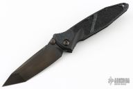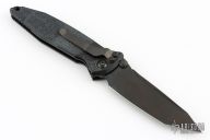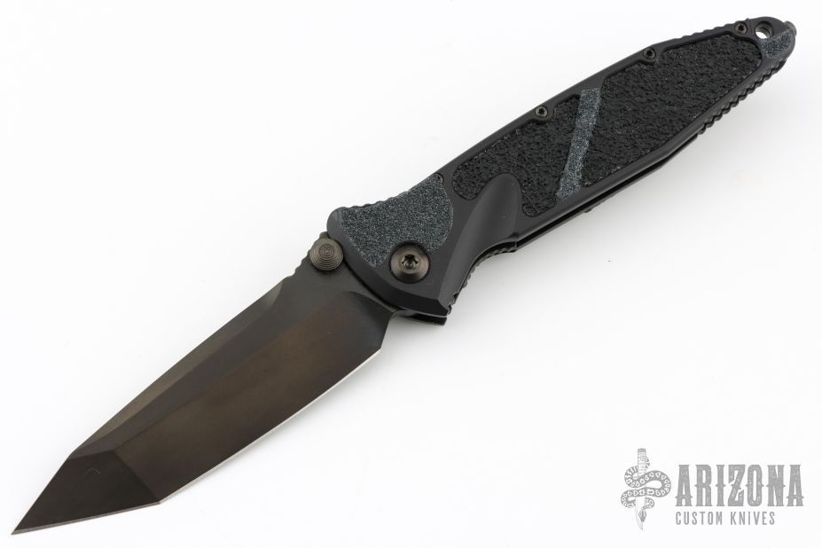 This Signature Series Socom Elite manual linerlock folder by Microtech Knives has a black DLC tanto blade with notched thumbrest and dual thumbstuds. Has a black aluminum handle with non-slip inlays, tip down stainless steel clip. Serial number 273 and dated 10/23. Comes with original box and papers. Previous owner has added talon tape to some sections of the handle and can easily be removed. Otherwise, Excellent condition.