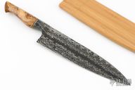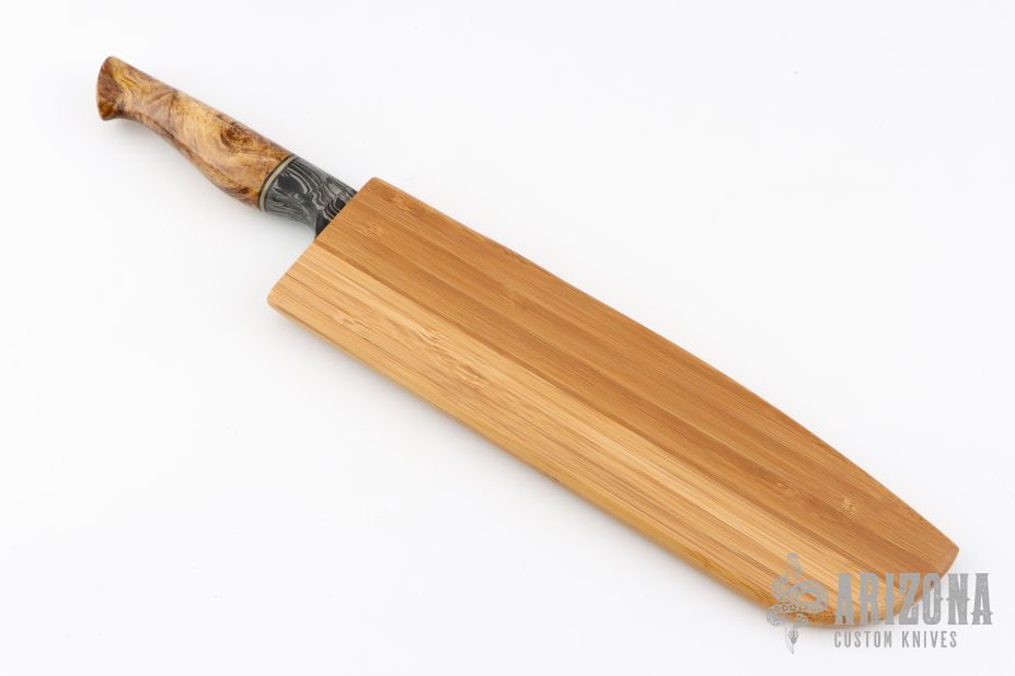 This Chef Knife by C Luis Pina features a Mosaic Damascus blade (15n20 and 1080), .43" blade stock and 2.057" blade depth, integral bolster with stabilized spalted wood grip with black G-10 and copper nickel spacer. The saya is made of bamboo and has magnets inside. Excellent condition.