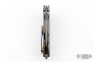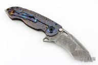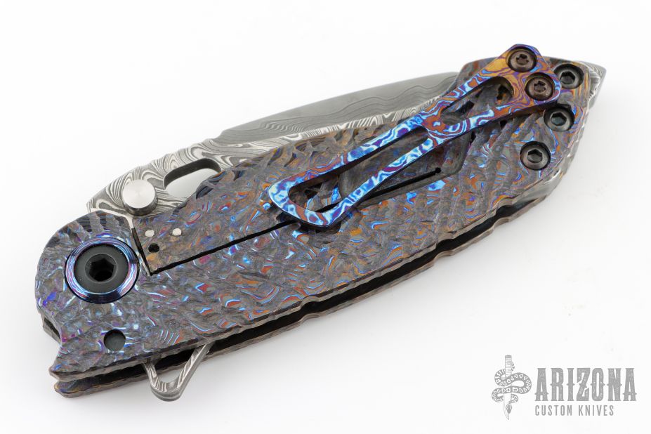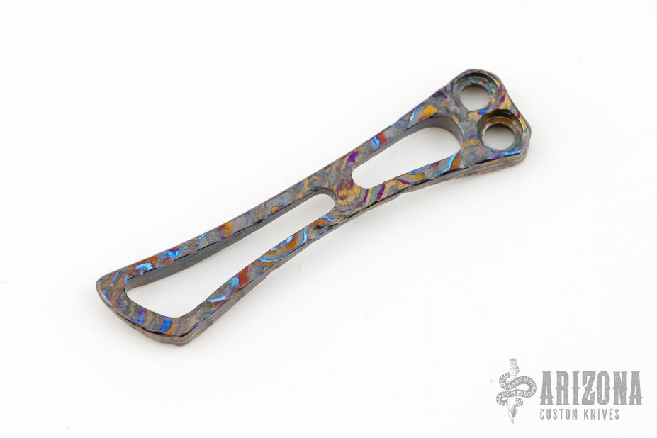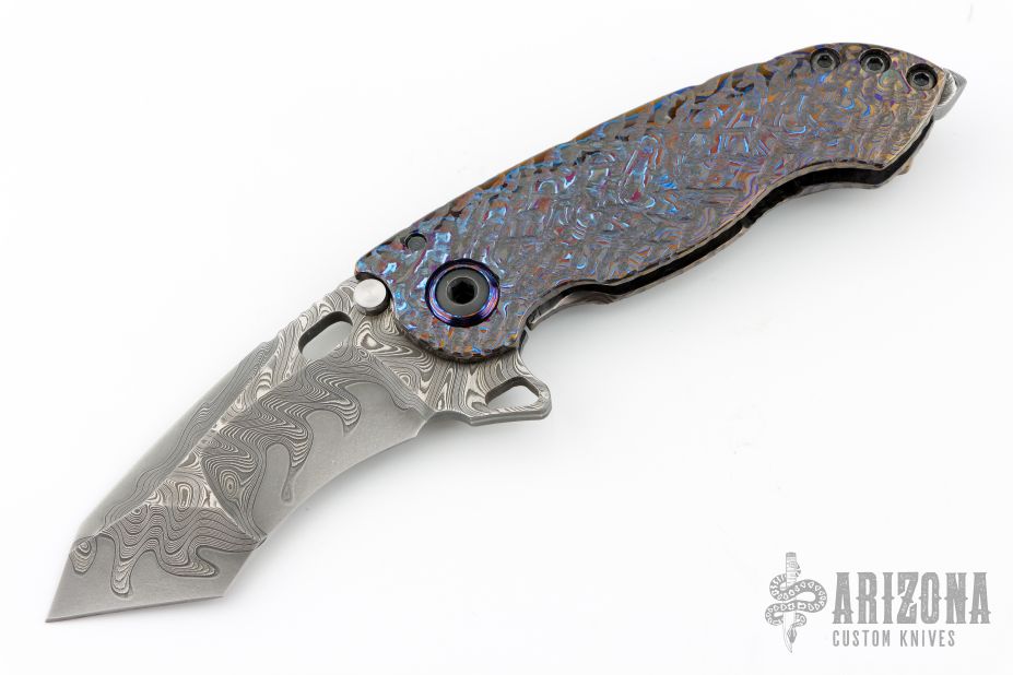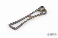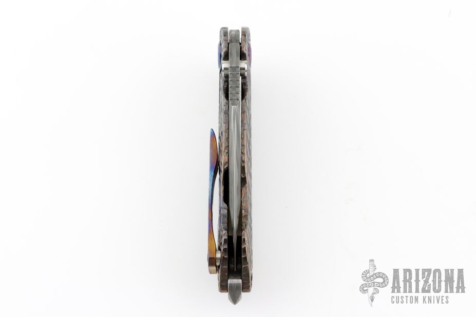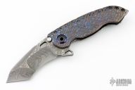 This Solo Flipper by Direware Custom Knives features a recurve tanto Chad Nichols Core Damascus blade with swedge, notched thumbrest, dual blade stops and flipper. The handle has a carved zircuti frame, timascus pivot collars and clip positioned for tip up carry, matching Damascus backspacer. Listing also includes a matching/carved zircuti clip as well, not attached. Excellent condition.