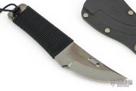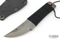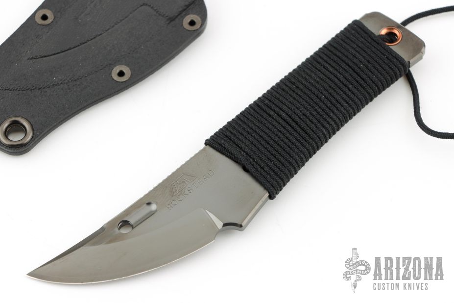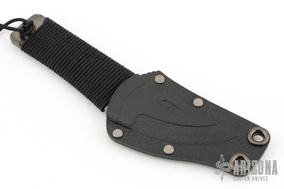 This Chou neck knife by Rockstead features a DLC coated blade with 1/8" blade thickness and 7/8" depth. The handle is black cord wrapped. Wicked sharp. Includes original Kydex sheath, papers, and bag. Has a couple light scuffs, otherwise Excellent condition.