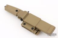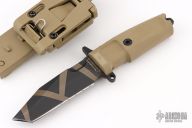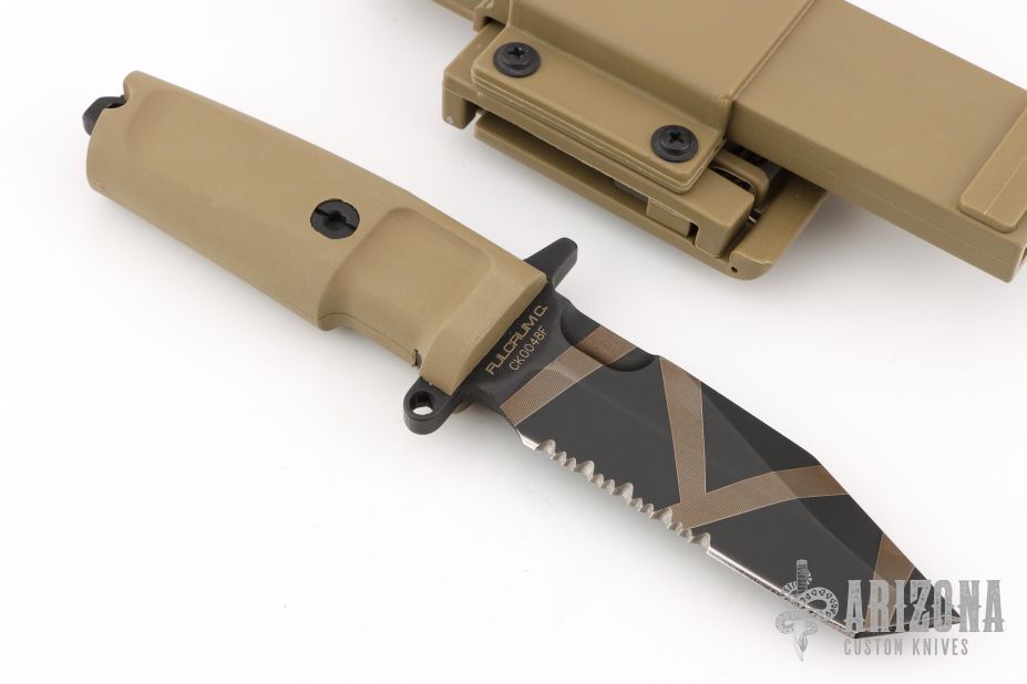 This Fulcrum C has a Testudo coated N690 stainless steel partially serrated tanto blade with hidden tang, notched thumb rest and double guard. Blade width is .248", depth is 1.092". Handle is Forprene non-slip with exposed tang/glass breaker and lanyard hole. Comes with original box, papers and Kydex sheath with clip. Has a couple light scuffs, otherwise excellent condition.