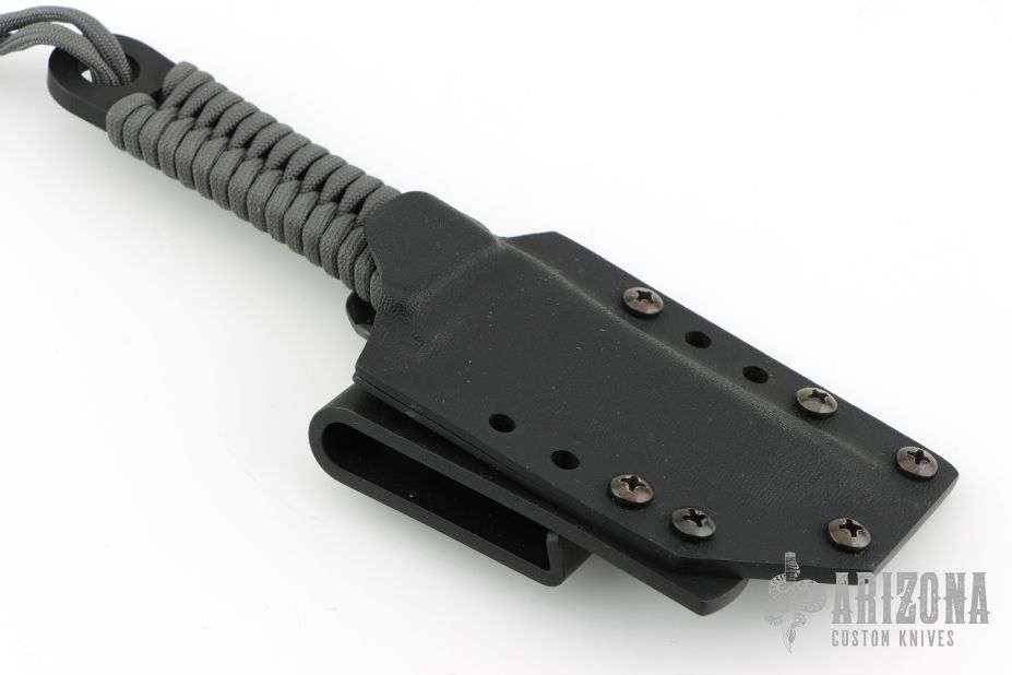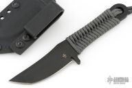 This SBT from Borka Blades features a tumble DLC coated blade with .190" blade stock and 1.193" blade depth, full tang construction. The handle is comprised of black paracord wrap. Includes kydex sheath with clip and original box. Excellent condition.