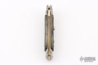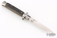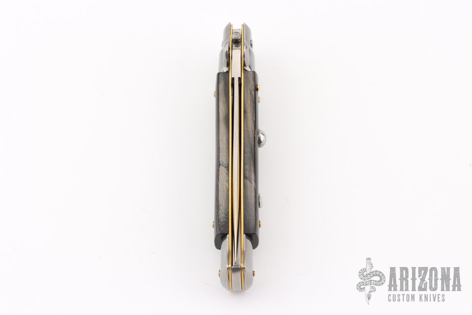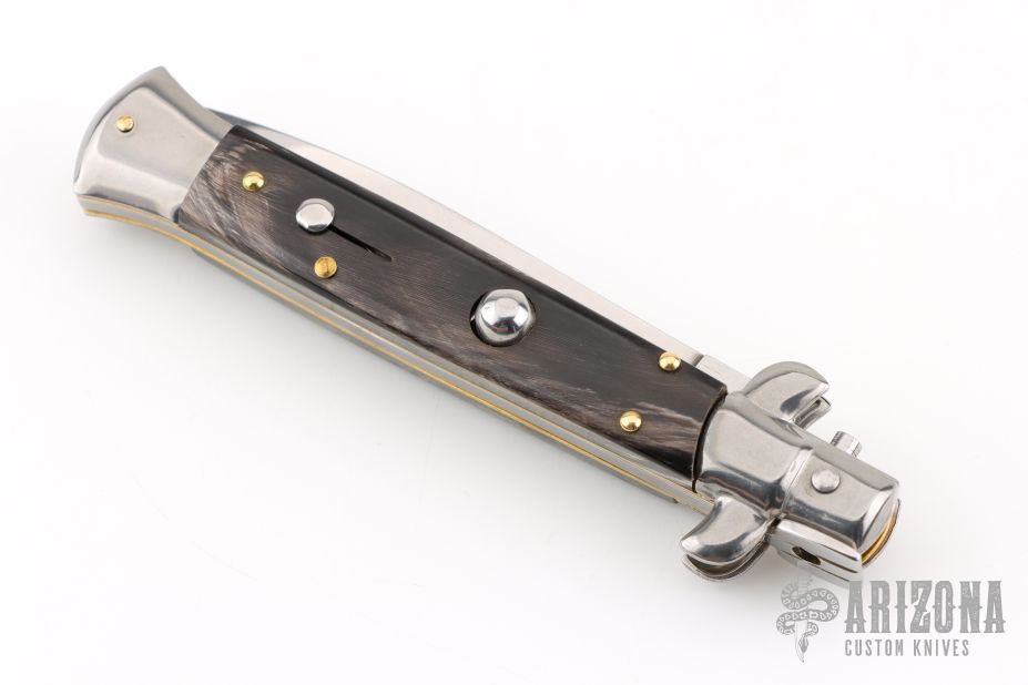 This Swivel Bolster by Frank Beltrame features a polished dagger ground blade with false top edge. The handle has stainless steel bolsters, front and rear, buffalo horn scales, brass liners, stainless spring. Excellent condition.