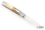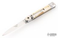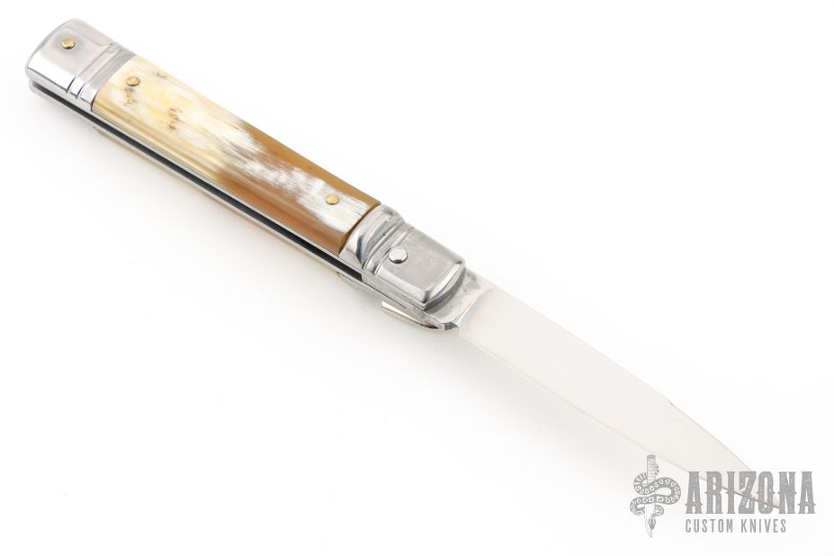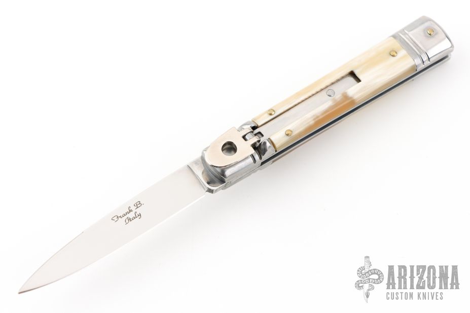 This leverlock Auto by Frank Beltrame features a mirror polished blade. The handle has fluted stainless steel bolsters, horn scales, stainless steel liners and backspacer. Nice action, lockup and blade seating. Excellent condition.