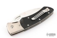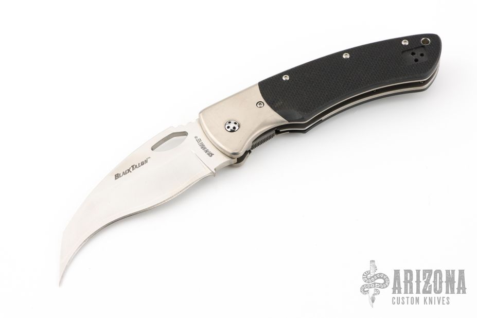 This Black Talon by Cold Steel features a satin finished hawkbill style San Mai blade with swedge and notched thumb ramp. The handle is comprised of titanium bolsters and black G-10 scales. Includes a tip up stainless steel pocket clip. Excellent condition. Includes a Cold Steel box. This model has been discontinued.