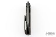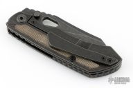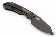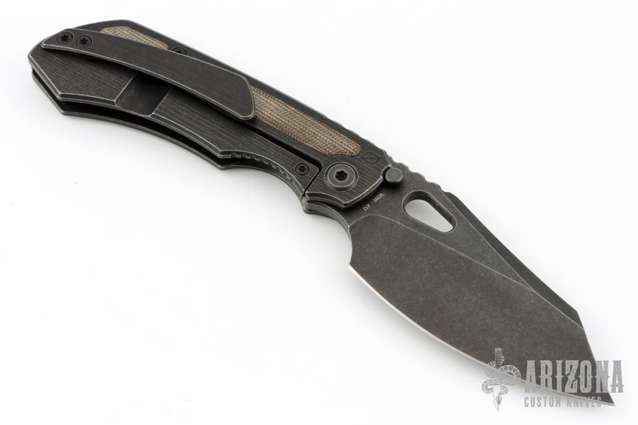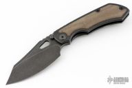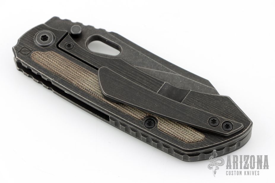 This Evolution 3.0 by Custom Knife Factory features a dark stonewash finished blade with notched thumbrest and thumbhole. The handle has a dark stonewashed bark finished titanium frame with a backspacer. Micarta inlays, and ZrTi tip-up clip. Comes with velcro case, additional clip, and COA. Nice detent, lockup and blade seating. Excellent condition. #432 and dated 8-22.