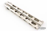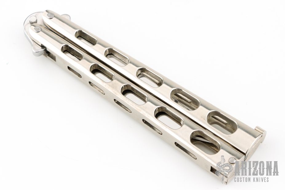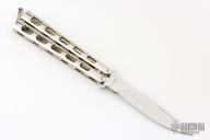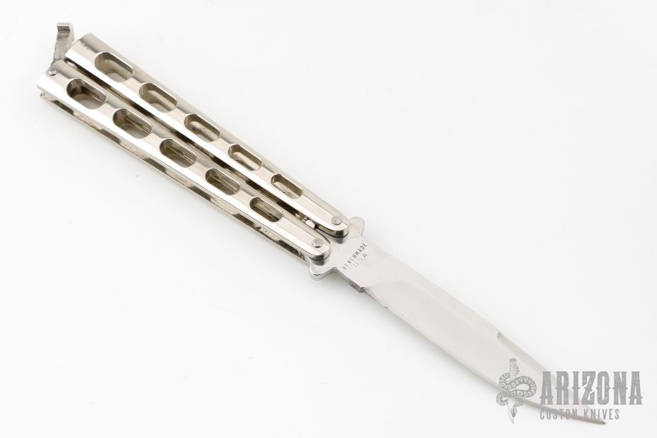 This Model 239 balisong by Benchmade features a polished stonewashed blade with false top edge. The Zanak handle has polished finish and latch. Has some light scratches, otherwise excellent condition. Comes with a black nylon sheath.
