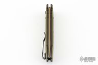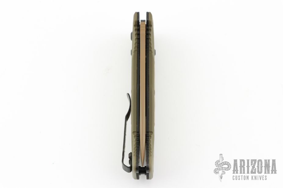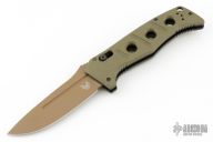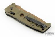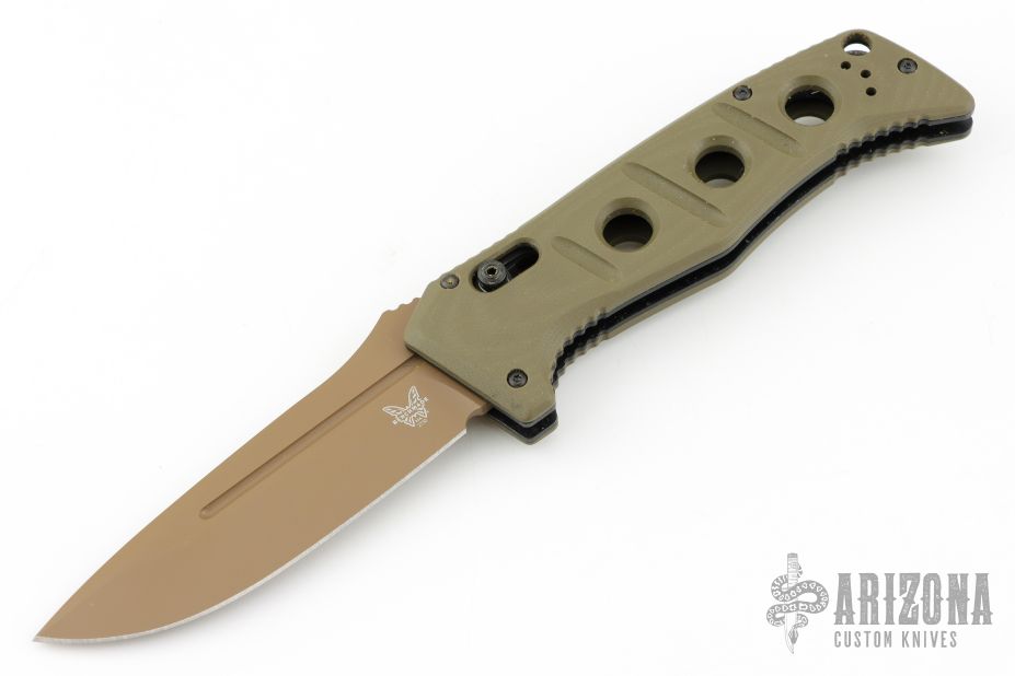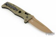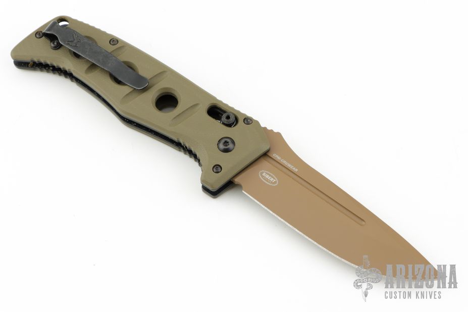 This Siebert designed 2750FE-2 Adamas Auto Axis Lock has a FDE coated drop point blade with fullers and notched thumbrest. Handle is OD G-10 over black stainless steel liners, reversible tip up black stainless steel clip, and spine safety button.  Includes tan nylon sheath. Comes with a Benchmade box and papers. New condition.