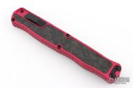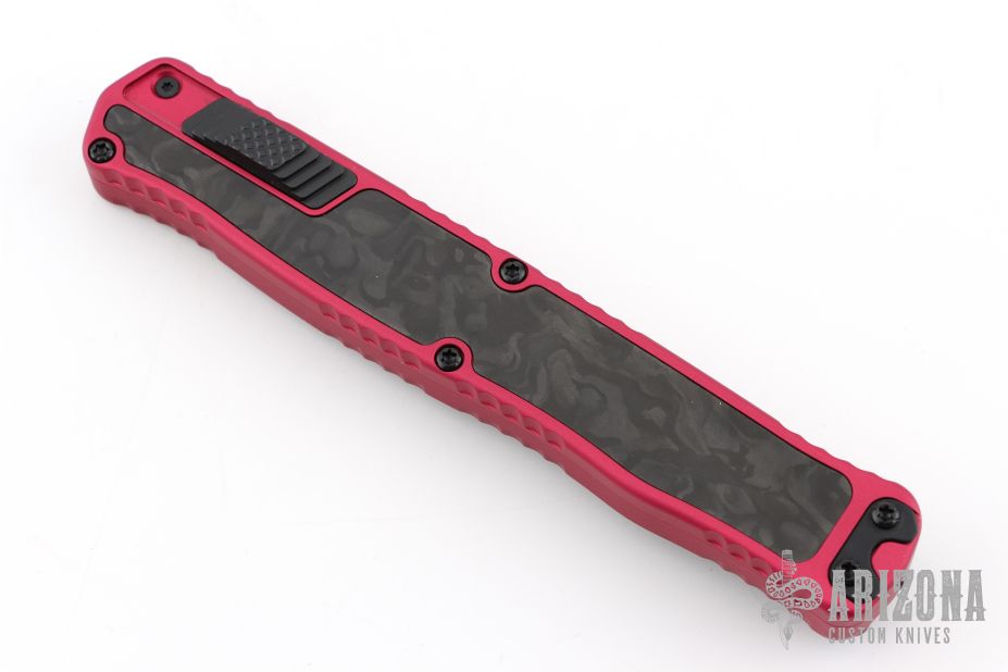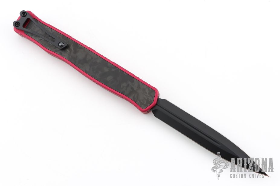 This Cleric II OTF by Heretic Knives features a black double edged Magnacut blade. The handle has a red aluminum frame with marble carbon fiber inlays, DLC titanium tip down clip. Comes with original box and lube. Excellent condition.