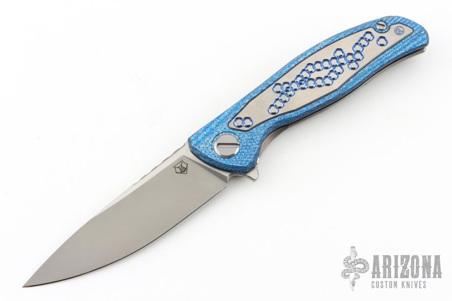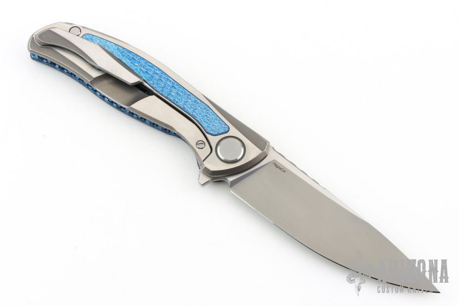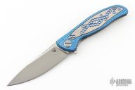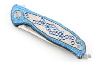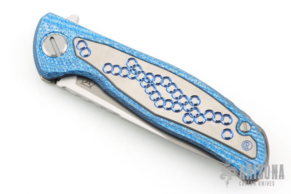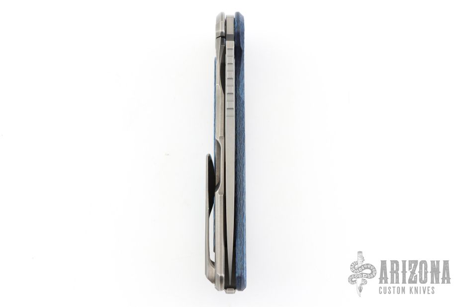 This Hati CGG is a collaboration between Chris Reeve Knives and Shirogorov Knives, notched thumbrest and flipper. The handle has an blue Alutex front scale with a titanium inlay with unique graphic, two-tone titanium lockside with blue Alutex inlay, matching tip up clip and backspacer with lanyard hole, stainless lockface insert. Rides on Roller Bearing System, nice detent, lockup and blade seating. Comes with original box and COA dated 2025. New condition.