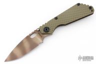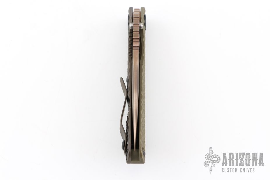 This SNG DGG by M Strider has a stonewashed and ghost striped blade with bronzed finish, dual thumb studs, thumbhole, and notched thumbrest. Handle is green G-10 and an antique bronze titanium "Gunner Grip", lockbar stabilizer, and titanium tip up clip. Nice detent, lockup and blade seating. New condition.