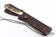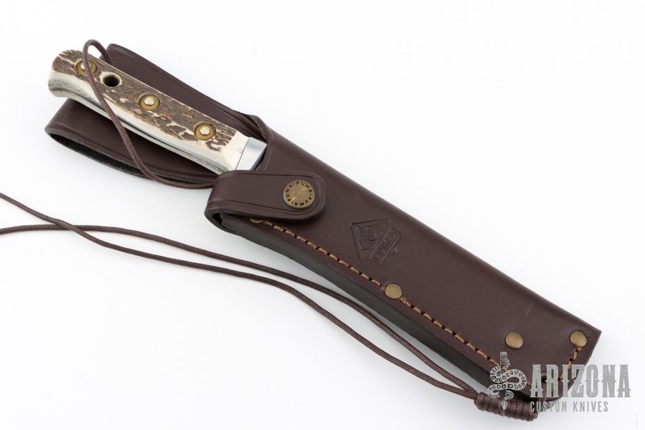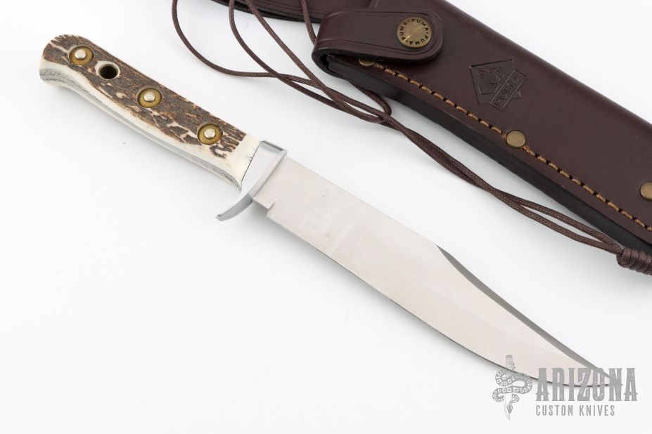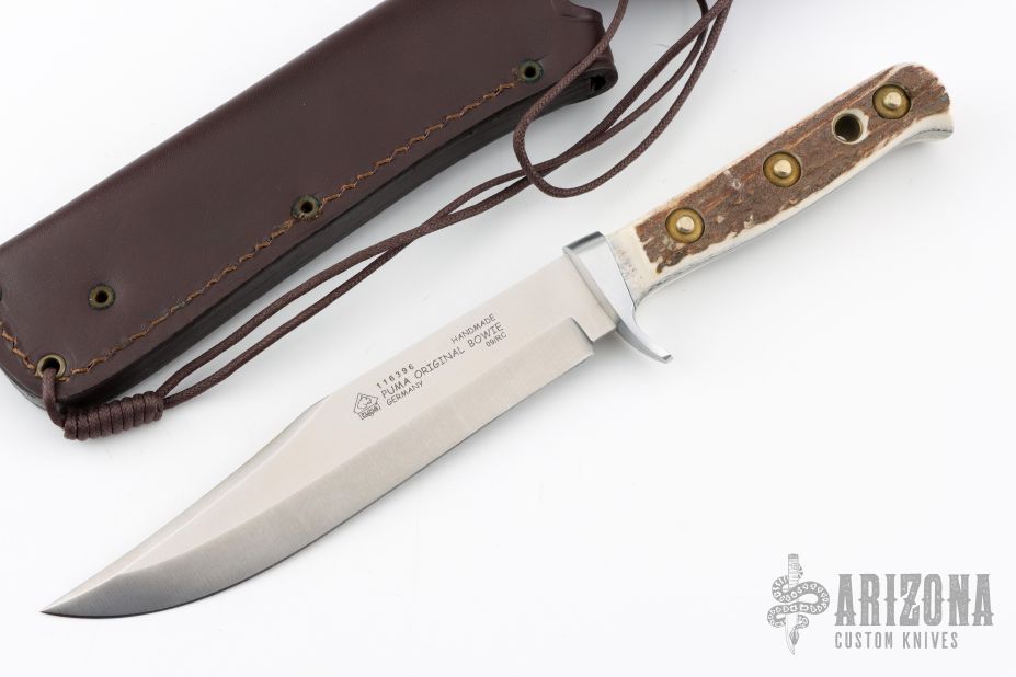 This Original Bowie by Puma features a satin finished blade with false top edge, .150" blade stock and 1.220" blade depth, full tang construction. The handle has an aluminum guard, stag scales and a lanyard hole at the butt. Comes with original box, papers and brown leather sheath. Excellent condition.