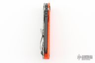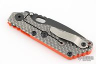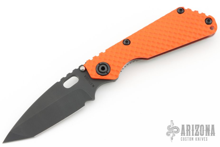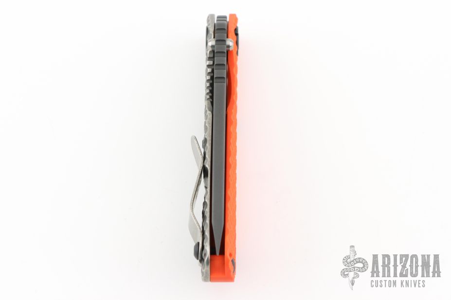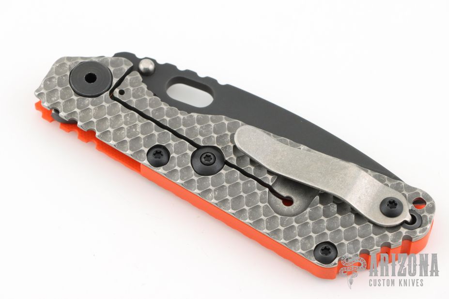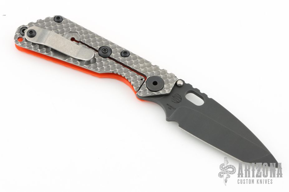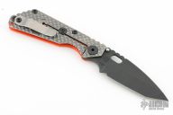 This SNG DGG by M Strider has a black tanto blade with dual thumb studs, thumbhole, and notched thumbrest. Handle is orange G-10 and titanium "Gunner Grip", lockbar stabilizer, and titanium tip up clip. Nice detent, lockup and blade seating. Excellent condition.
