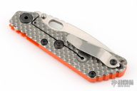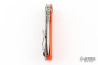 This SNG DGG by M Strider has a stonewash blade with dual thumb studs, thumbhole, and notched thumbrest. Handle is orange G-10 and titanium "Gunner Grip", lockbar stabilizer, and titanium tip up clip. Nice detent, lockup and blade seating. Excellent condition.