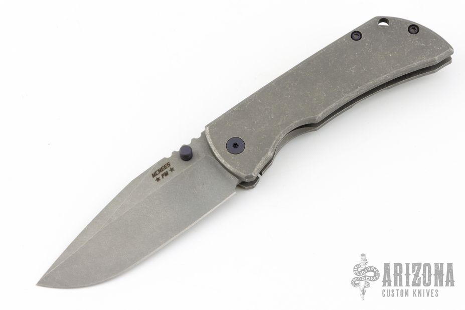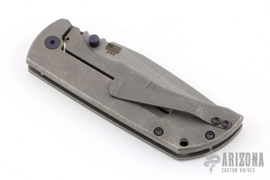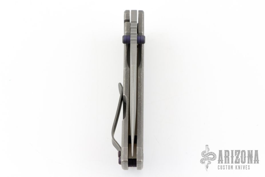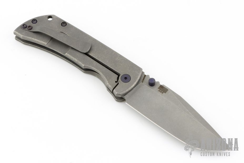 This MAC2 features a stonewashed drop point Magnacut blade with dual thumbstuds and a notched thumbrest.  The handle features a stonewashed atomic titanium frame with anodized hardware, and a matching tip up pocket clip. Includes the original box and COA. Excellent Condition.