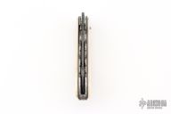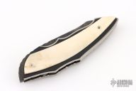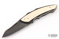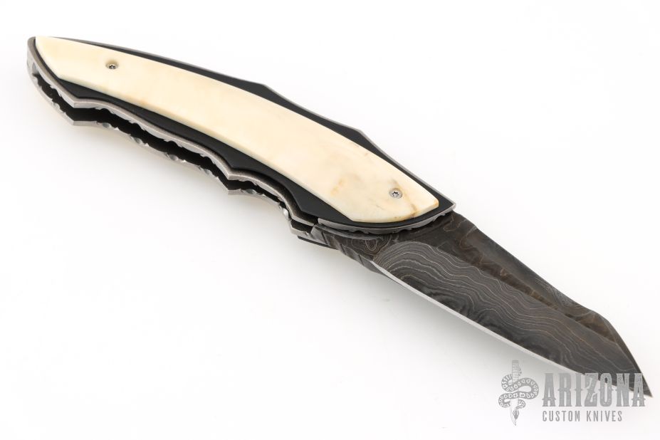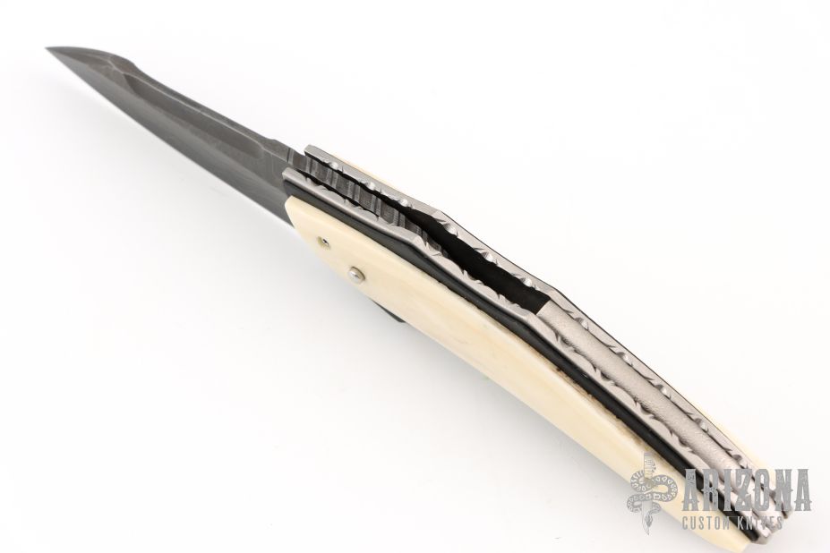 The X Ecute Front Flipper by Corrie Schoeman features a Damascus blade with a false top edge, fileworked spine and under ricasso. The handle has warthog tusk scales over black G-10, fileworked and orange peel finished titanium liners and orange peel finished titanium backspacer. Rides on bearings, nice detent, lockup and blade seating. New from maker. Comes with a COA dated June 2025.