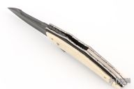 "I started making knives over 30 years ago while at University. My first knife was a big Bowie made from a car spring and I obtained a piece of stag from the local zoo for the handle. I still have and treasure that first knife. In my younger days I was very involved in martial arts yet could not buy Japanese weapons to train with, so I made my own, a short sword called a "sai". My fellow students were enthralled and I began taking orders to make more. Although having earned two university degrees, I continued to make knives part-time, but it became such a passion that I left my profession and am now a full-time knifemaking artist. I have been a member of the South African Knifemakers Guild since 1985. Today I only make folders and automatics, using the best exotic materials such as mammoth ivory, pearl, damascus and damasteel. All my folders have fileworked liners and backstraps, each folder has a jewel inlaid somewhere on the knife as well as in the thumbstud."