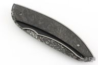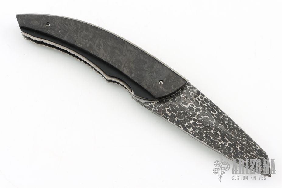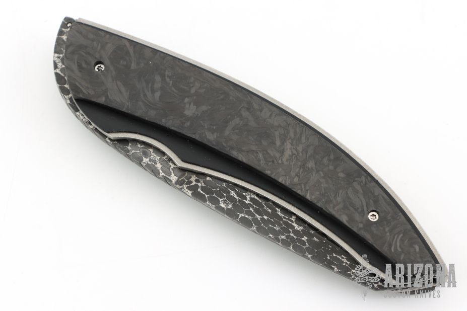 This Panerai Linerlock Flipper has a Pieter Goosen Damascus blade with fileworked spine and flipper. Handle has marble carbon fiber scales over black G-10 and fileworked and orange peel finished titanium liners, and an orange peel finished titanium backspacer. Great blade seating, lockup and detent. New from maker. Comes with COA dated March 2024. Has a light scuff on the blade.