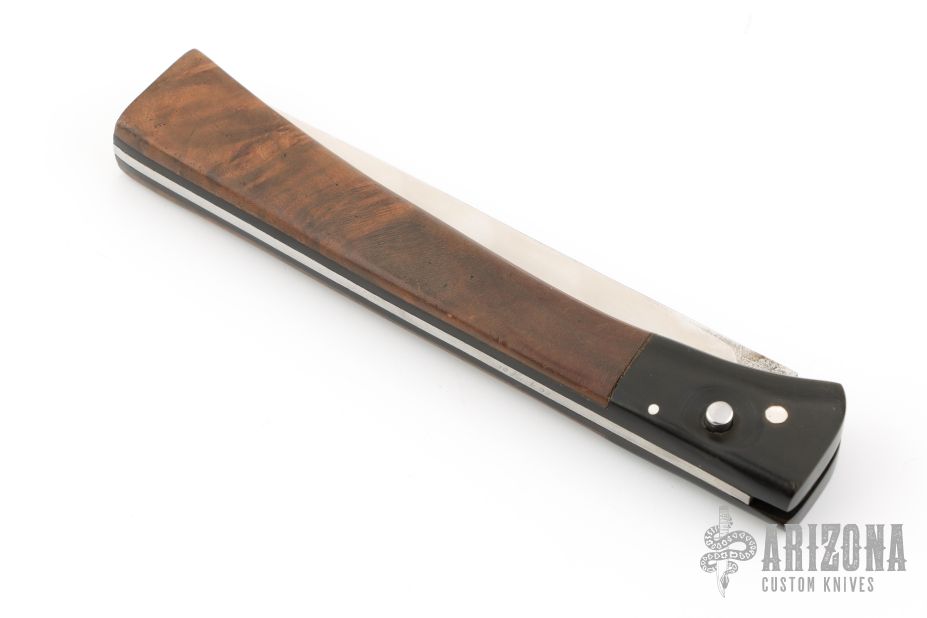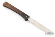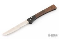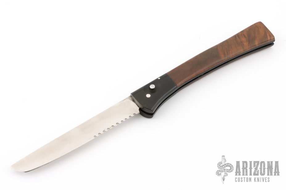 This Side Opening Auto by James Huckeba has a satin polish finished tanto blade with partial serrations. The handle is black micarta with stainless button, fittings, and wood overlays. Has some scuffs and scratches, great condition otherwise.