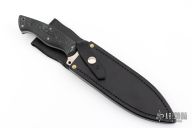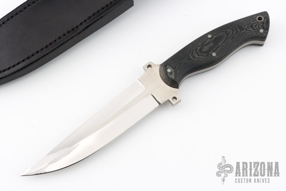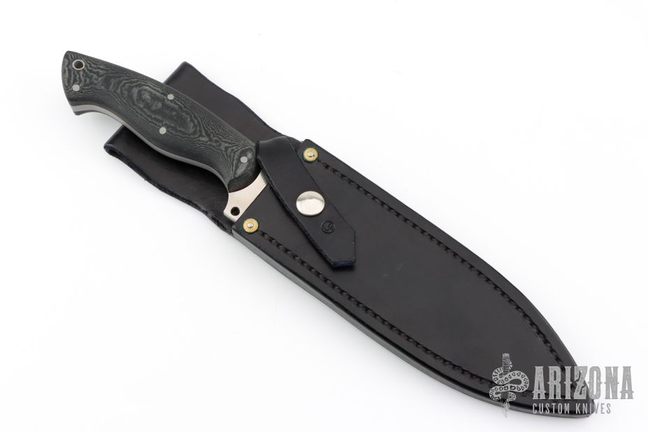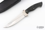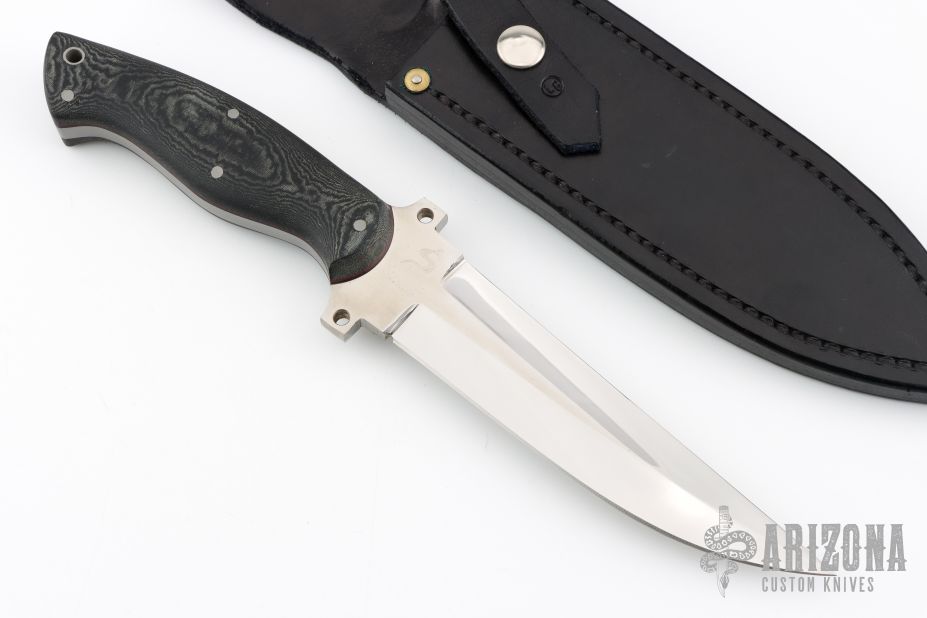 This Fighter by Joseph Szilaski Design features a mirror polished blade with false top edge and satin finished flats, .255" blade stock and 1.416" blade depth full tang construction. The handle has black linen micarta scales with red and black liners. Includes a black leather sheath. Has some light scratches, otherwise excellent condition. Dated 1994