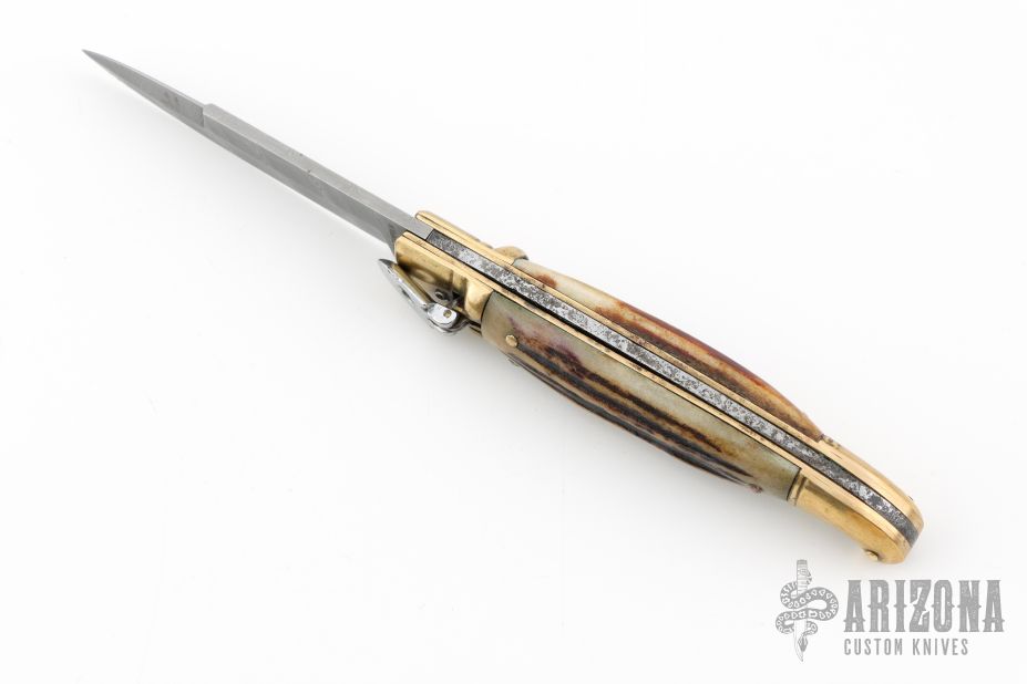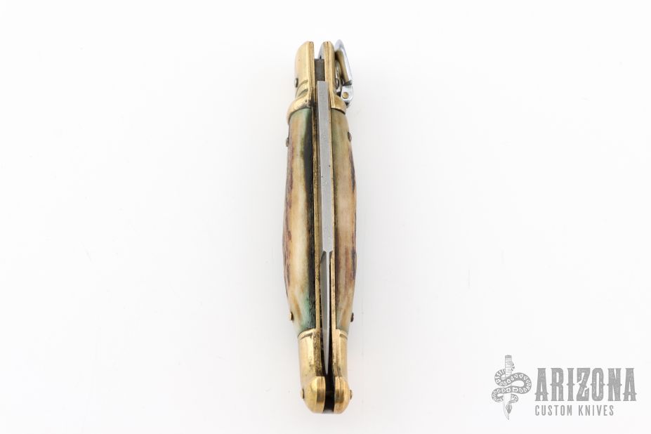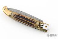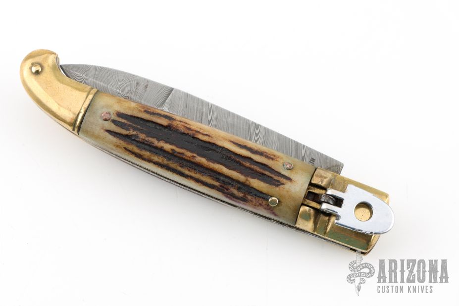 This Leverlock by AGA Campolin features a Damascus blade with false top edge. The handle has brass bolsters, stag scales, brass liners, steel backspacer. Nice action, nice lockup and blade seating. Has some scuffs and scratches, has some pitting on the backspacer, otherwise good condition. Comes with a zippered case.